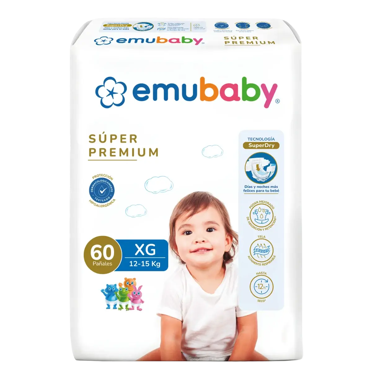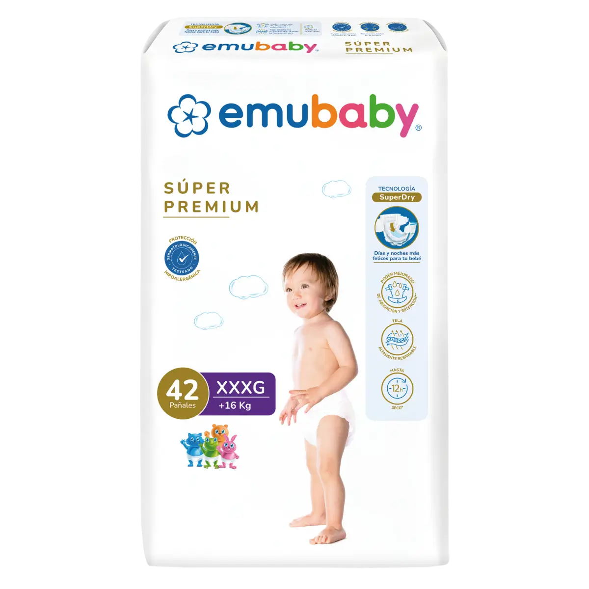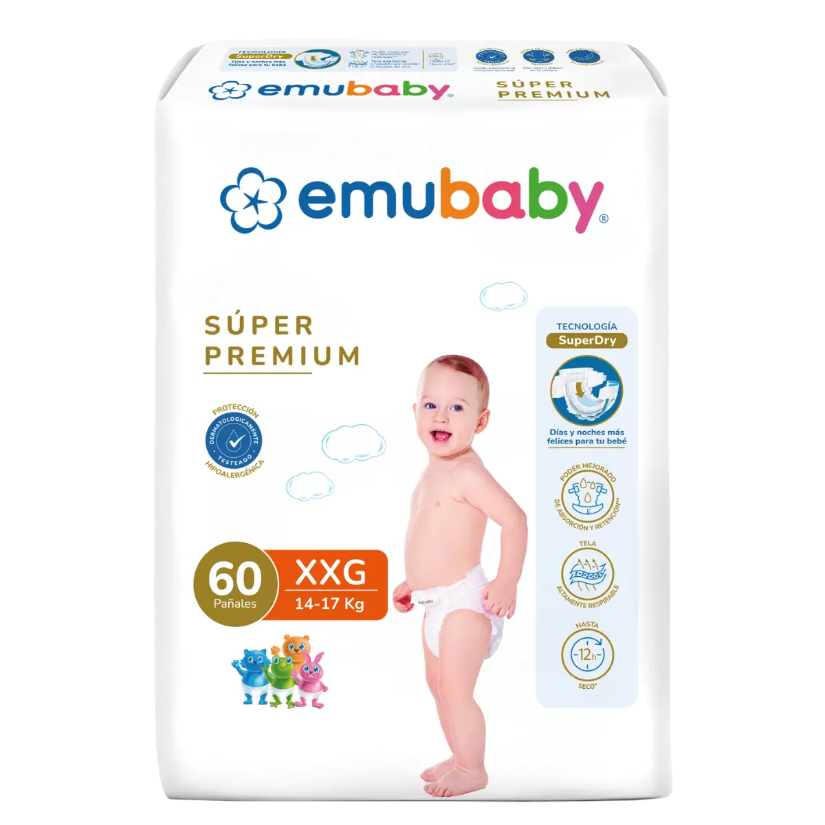 Emubaby Súper Premium destaca por su absorción avanzada y protección dermatológica para mantener al bebé seco por más tiempo
